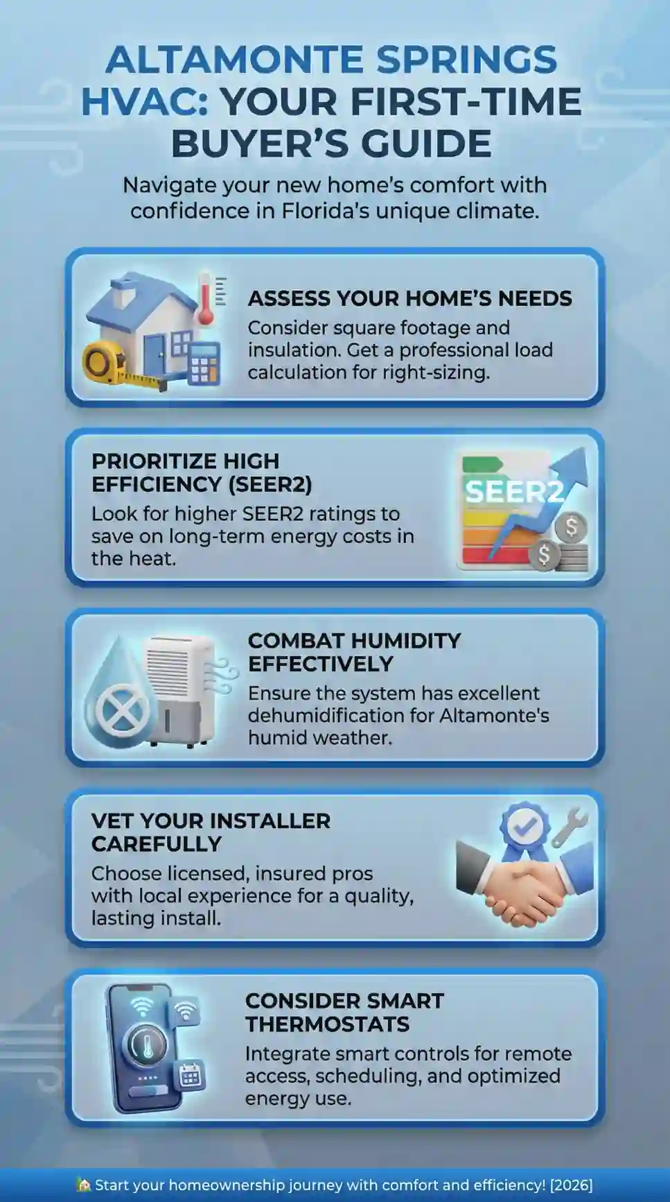 "After working across hundreds of Altamonte Springs homes, the most expensive HVAC mistake we see first-time buyers make isn't choosing the wrong equipment — it's inheriting a system with no documented sizing methodology and no ductwork history, then replacing it under pressure in July when the leverage is gone and the sequence that protects long-term performance gets compressed into a single afternoon. The installation decisions made on day one of homeownership set the ceiling for every utility bill, every air quality outcome, and every repair call for the next 15 years. Getting that sequence right before closing costs nothing. Getting it wrong after closing costs everything."